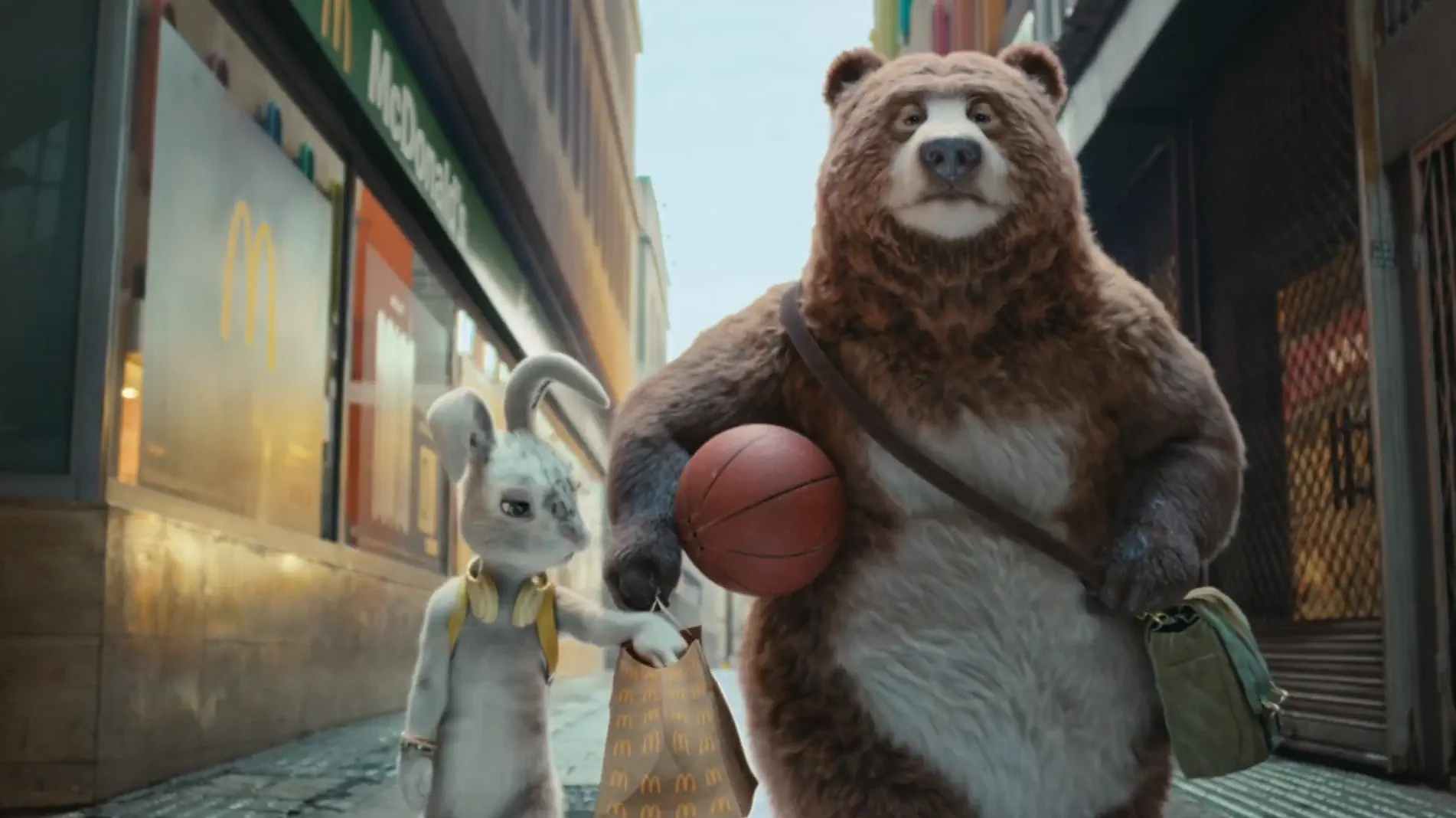 Французское подразделение McDonald’s совместно с агентством TBWA\Paris запустило рекламную кампанию «Bear with me» («Прояви терпение»; игра слов: bear — «медведь», «мириться»). Ролик построен на визуальной метафоре: зритель наблюдает за историей медведя и кролика, которые проводят время вместе в городе. Медведь старается поддержать и развеселить расстроенного спутника, а кульминацией становится визит в McDonald’s.