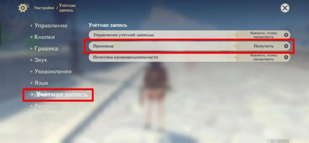 - Второй – ввод кода прямо в игре (в мобильной, компьютерной или консольной версии – не важно). Находится он по пути “Меню” – “Настройки” – “Учетная запись” – “Промокод” – “Получить”.