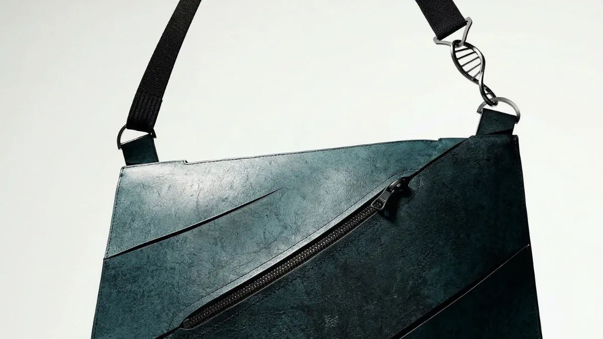 Первая в мире сумка из кожи, выращенной в лаборатории на основе ДНК тираннозавра, с использованием ИИ для реконструкции структуры белка, созданная как прототип для будущей устойчивой альтернативы традиционному кожевенному производству.
